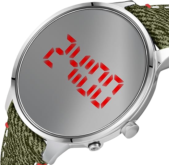 This denim-inspired digital watch features a bright red display with easy-to-read numerals—making it easy to glance at a glance. It's perfect for busy mornings or outdoor adventures. The gray-green denim-patterned strap adds a touch of casual cool. A standout accessory for a casual look!