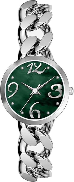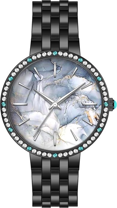 This diamond-embellished women's watch features a unique swirling pattern on the dial that resembles natural marble, creating a stylish and eye-catching look. This artistic yet practical watch is sure to make you stand out! Brilliant diamonds and turquoise gemstones set around the bezel add an extra touch of glamour. Whether casual or formal, it's a stunning addition to any outfit.
