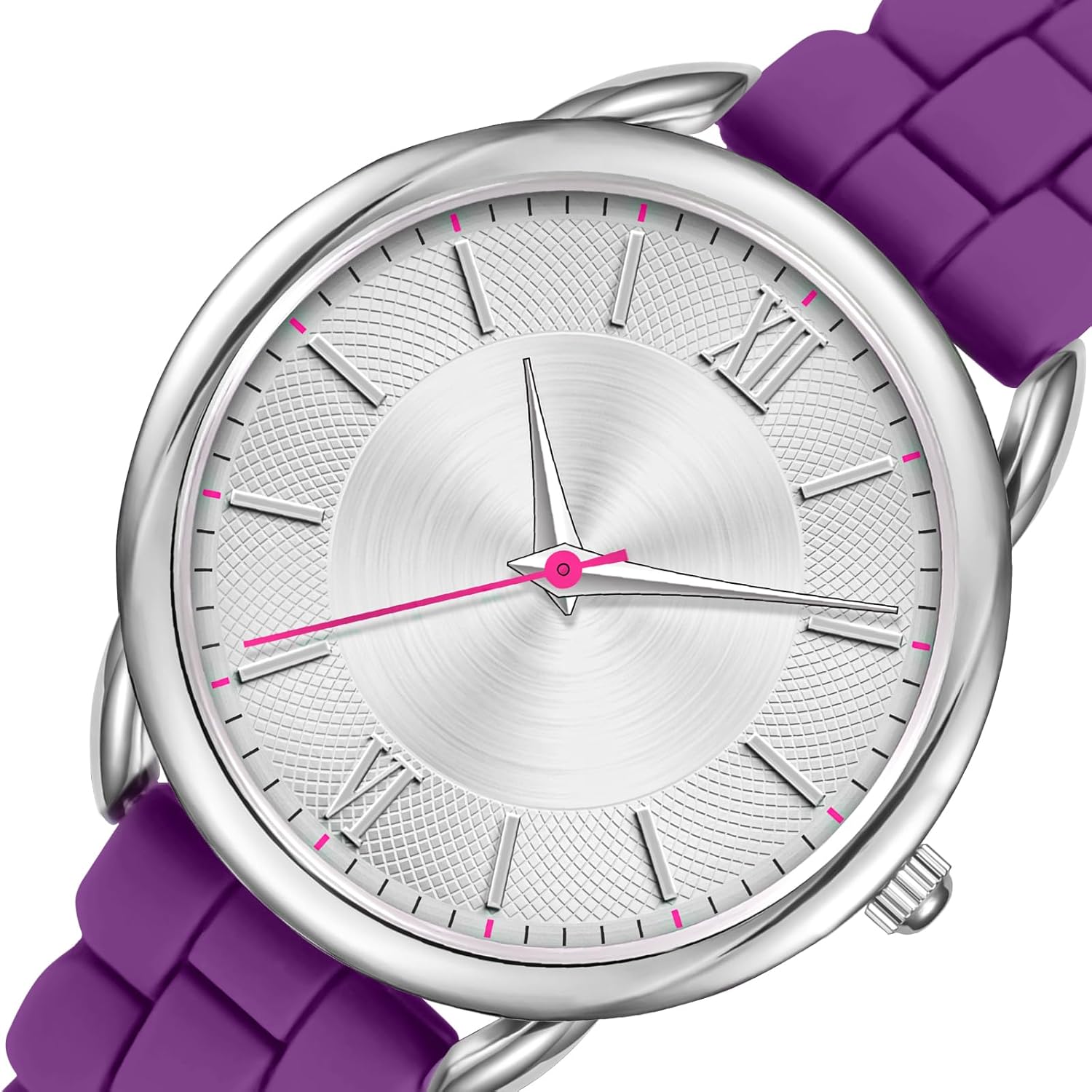 This women's watch features a simple and elegant design. Its silver-white dial, pink hands, and classic Roman numerals complement the vibrant purple silicone strap, creating a stylish and chic watch. The classic Roman numerals blend with the delicate texture of the dial, creating a timeless elegance that effortlessly complements the office, a date, or everyday wear.