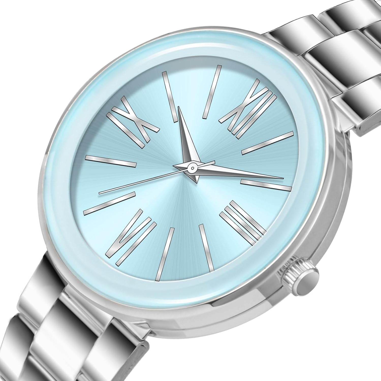 This elegant light blue dial watch with a steel band for women creates a soft, sophisticated color paired with classic Roman numeral hour markers for a timeless elegance. Perfect for work, dinner, or a casual outing, it's the perfect watch. The refined stainless steel and silver-toned band exude a refined and elegant look. It goes with everything from a business suit to jeans!