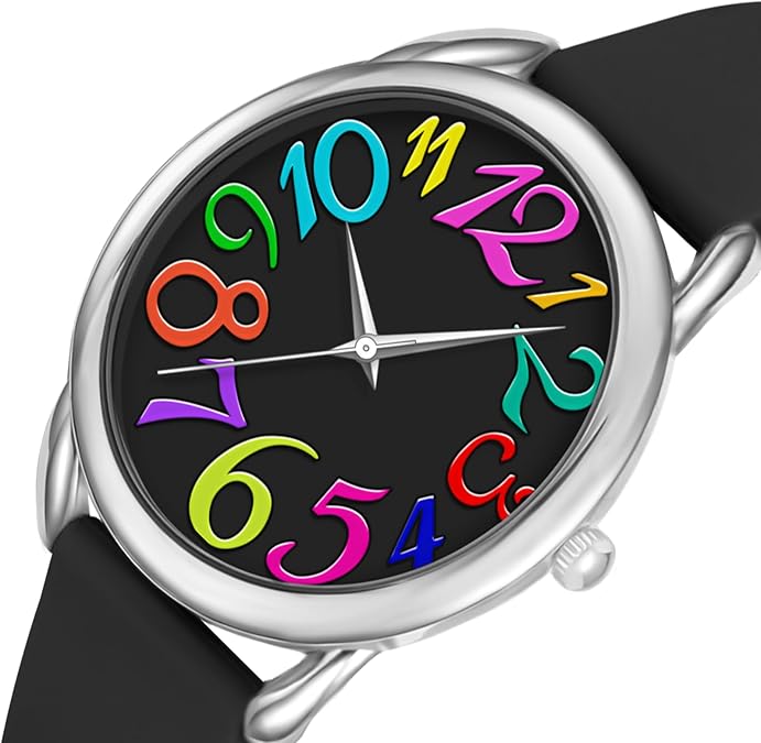 This women's watch features an eye-catching, colorful dial. The vibrantly colored numbers 1 through 12 are arranged across the black dial, creating a playful and lively visual effect. More than just a timepiece, it's a piece of art on your wrist, making it easy to stand out in any crowd.
