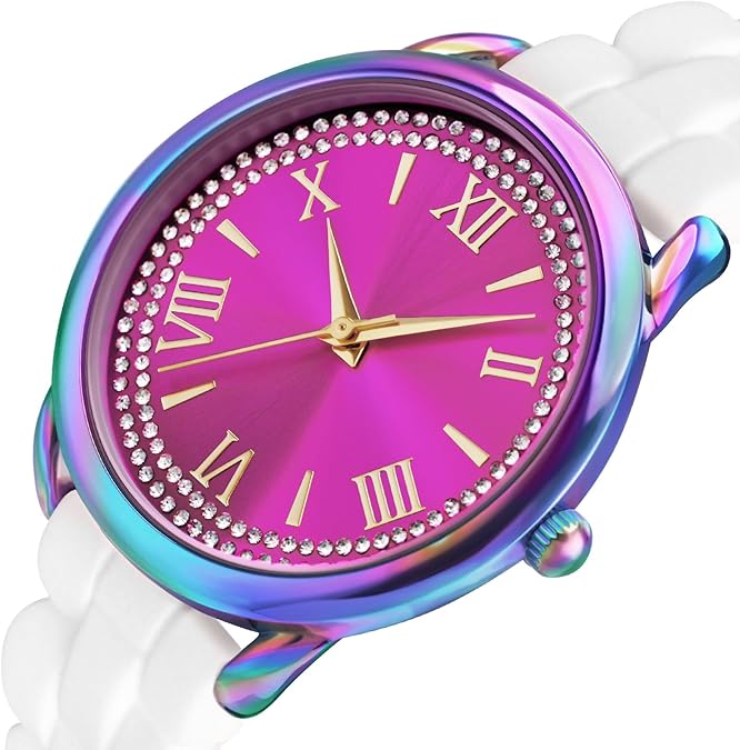 This dazzling women's watch features a colorful bezel and silicone strap. The rainbow-colored diamond bezel and pink dial create a dazzling display! Perfect for parties, dates, or simply adding a touch of fun to your everyday look. The silicone strap is practical and convenient: soft, durable, and water-resistant. Enjoy active play without worrying about sweat or water stains!