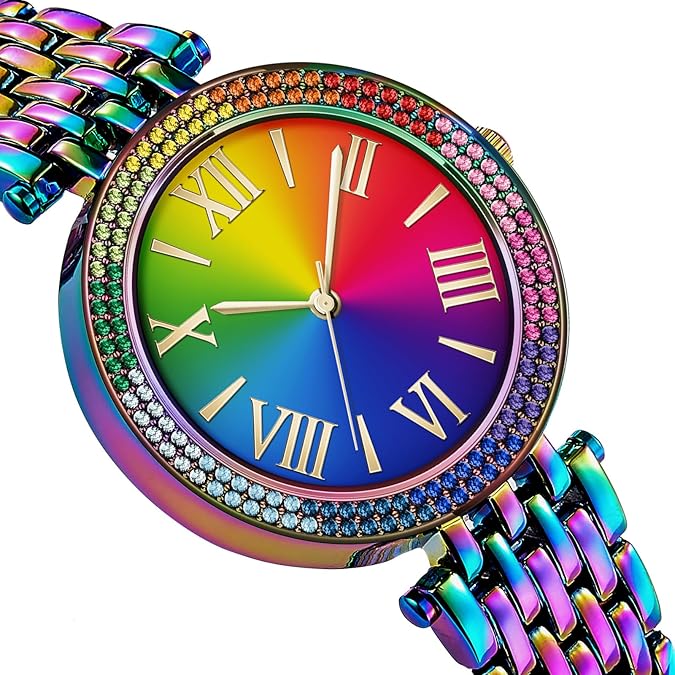 This women's watch features a rainbow dial and steel band. The vibrant colors complement the classic Roman numerals, creating a retro-cool vibe. Perfect for adding a touch of fun to any outfit—jeans, dresses, even a swimsuit cover-up! This rainbow-hued, multicolored band is a stunning statement piece. It can be worn as both a bracelet and a watch—a perfect blend of style and function!
